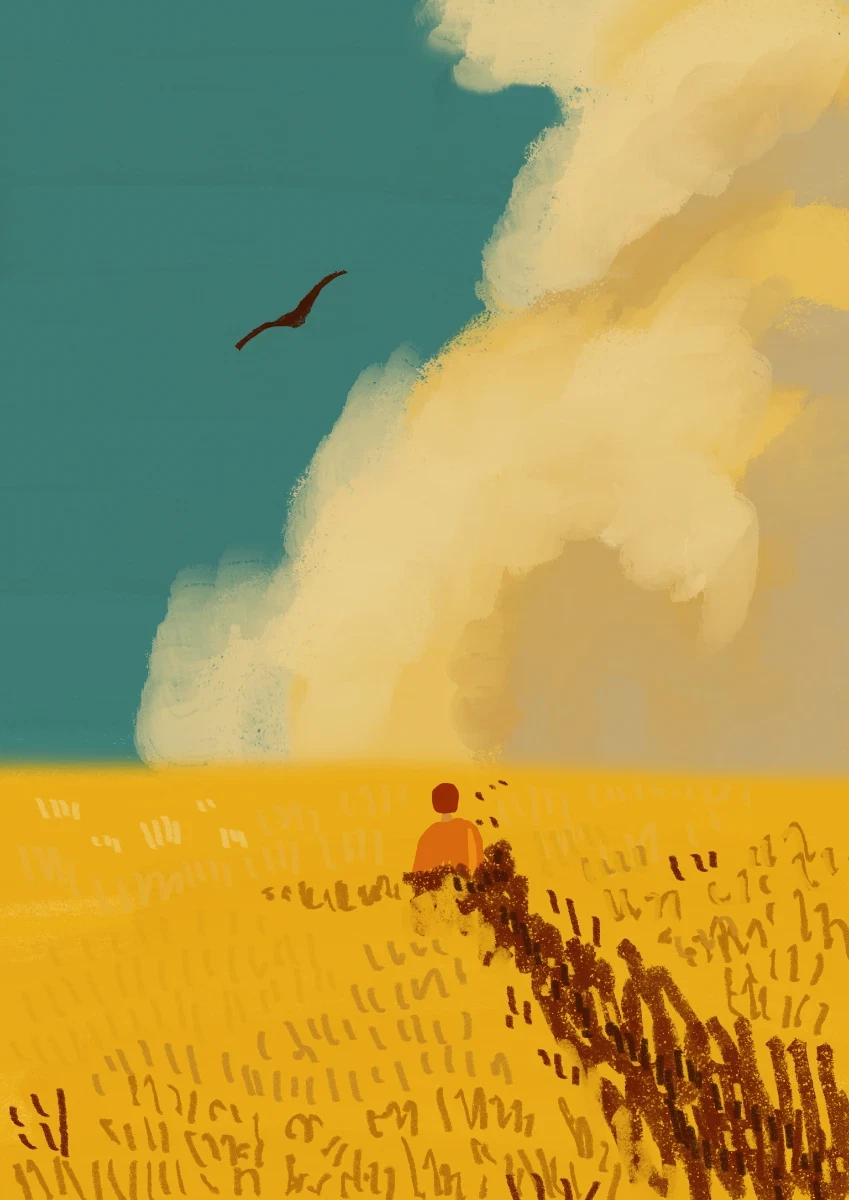 A man stands on a seemingly endless field of wheat—A5 print on 270gsm matte fine art paper.